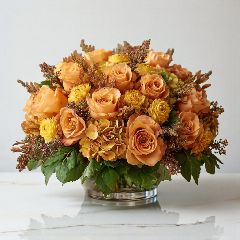 The “Autumn Glow” centerpiece is far more than just a floral arrangement—it’s a heartfelt expression of joy and gratitude. Imagine it gracing your dining table during festive meals, as a thoughtful gift brightening a loved one’s day, or as a standout centerpiece for intimate gatherings and events. Its lush display is crafted to inspire smiles, spark conversations, and create lasting memories. Embrace the versatility of this bouquet, and let it bring magic wherever you place it.