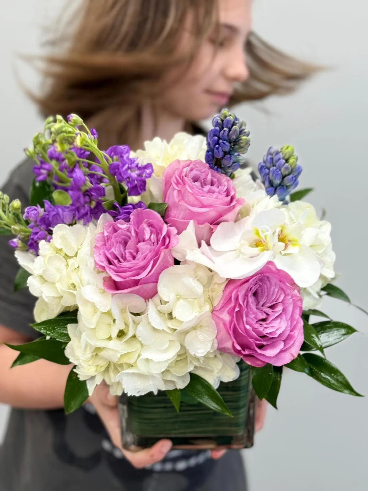 This stunning floral arrangement showcases a delicate mix of white, pink, and purple flowers, complemented perfectly by preserved roses. Its soothing palette exudes elegance and grace, making it a standout centerpiece for any setting.